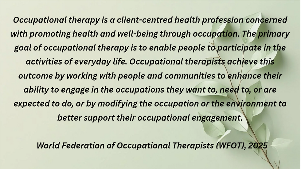 Occupational therapy is not just about recovery - it’s about rediscovery. Unlike other professions that focus solely on body systems, OT views the individual holistically - connecting physical, cognitive, emotional, and social factors to meaningful daily life.